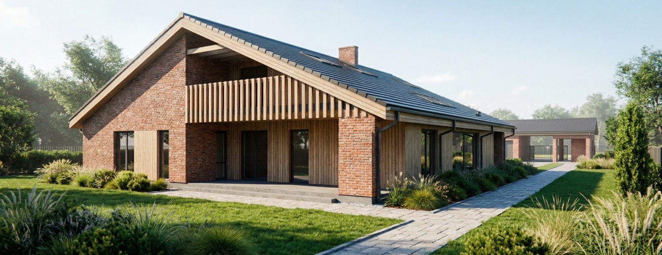 Przedstawiamy indywidualny projekt designerskiego domu jednorodzinnego z poddaszem użytkowym w Wojanowie, miejscowości położonej tuż obok Pruszcza Gdańskiego. Inwestycja powstała w wyjątkowej lokalizacji, w bezpośrednim sąsiedztwie historycznego parku, chętnie odwiedzanego przez mieszkańców pobliskich miejscowości. Ze względu na zabudowę starej wsi oraz charakterystyczny styl architektury tego obszaru budynek wjazdowy nawiązuje formą do okolicznej historycznej zabudowy, tworząc harmonijne połączenie tradycji i nowoczesności.