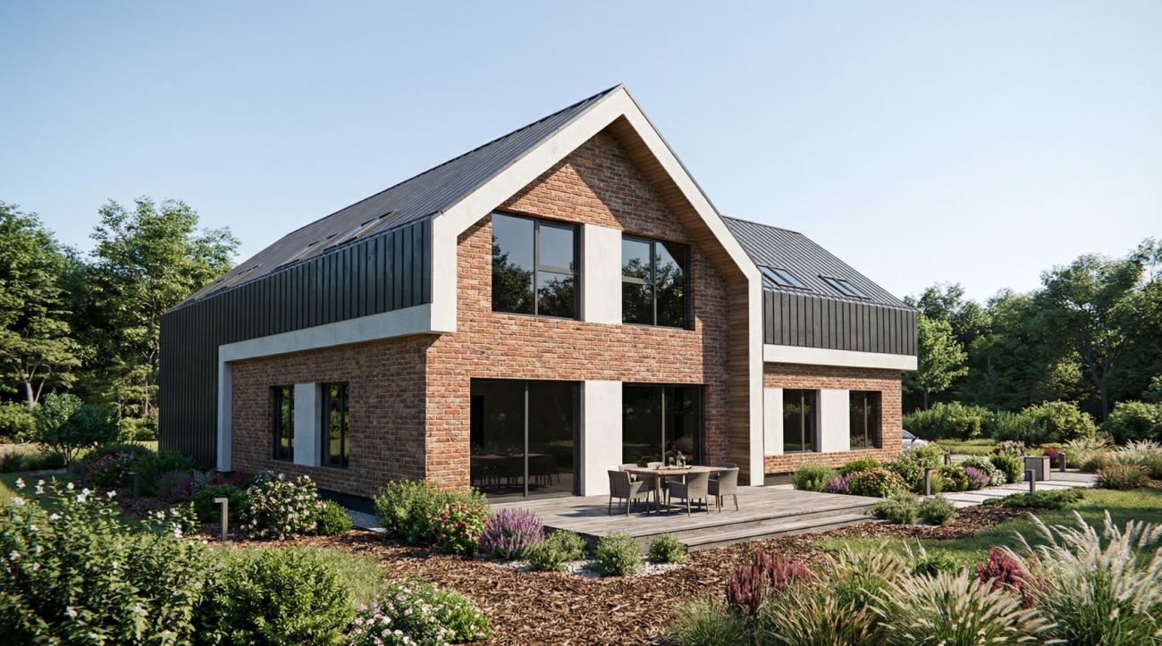 Ten świadomy zabieg materiałowy pozwolił uzyskać ponadczasowy efekt wizualny, który łączy to, co tradycyjne, z tym, co nowoczesne. Ceglana elewacja zapewnia trwałość i wysoką estetykę, a jednocześnie sprawia, że budynek w naturalny sposób wpisuje się w lokalny krajobraz.