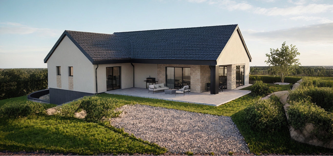 Przedstawiamy indywidualny projekt domu parterowego jednorodzinnego z częściowym podpiwniczeniem w Złej Wsi, malowniczo położonej miejscowości w bliskim sąsiedztwie Pruszcza Gdańskiego. Lokalizacja ta jest ceniona przez inwestorów za ciszę, bliskość natury oraz świetny dojazd do Trójmiasta, a jednocześnie zapewnia wygodny dostęp do infrastruktury usługowej i terenów rekreacyjnych.